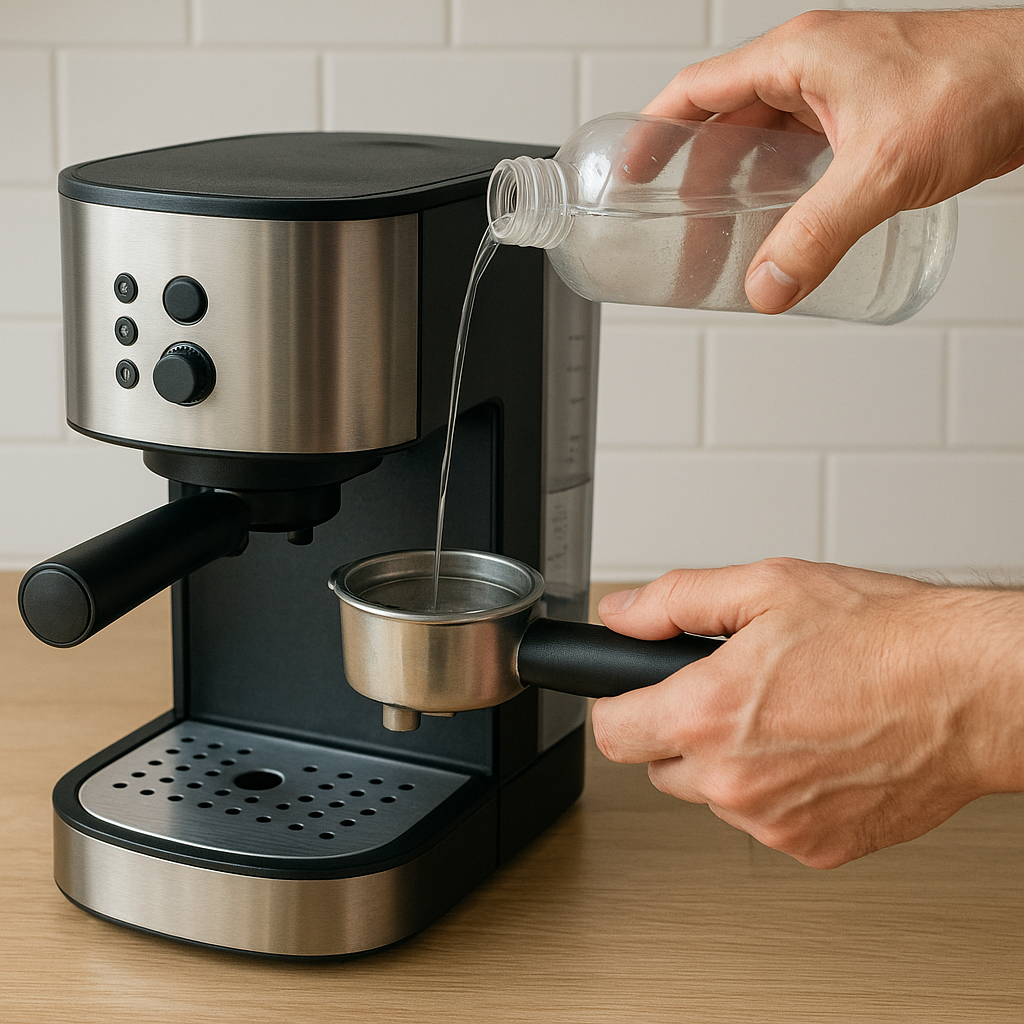- Odkamieniacz – może to być preparat dedykowany do ekspresów lub domowy roztwór na bazie kwasku cytrynowego czy octu;